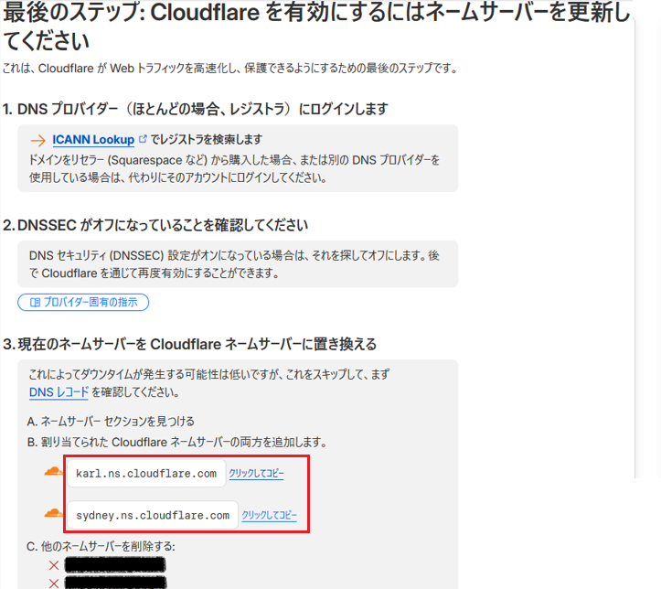 - Cloudflareが、皆さんのドメインに設定すべき2つのCloudflareネームサーバー(例: