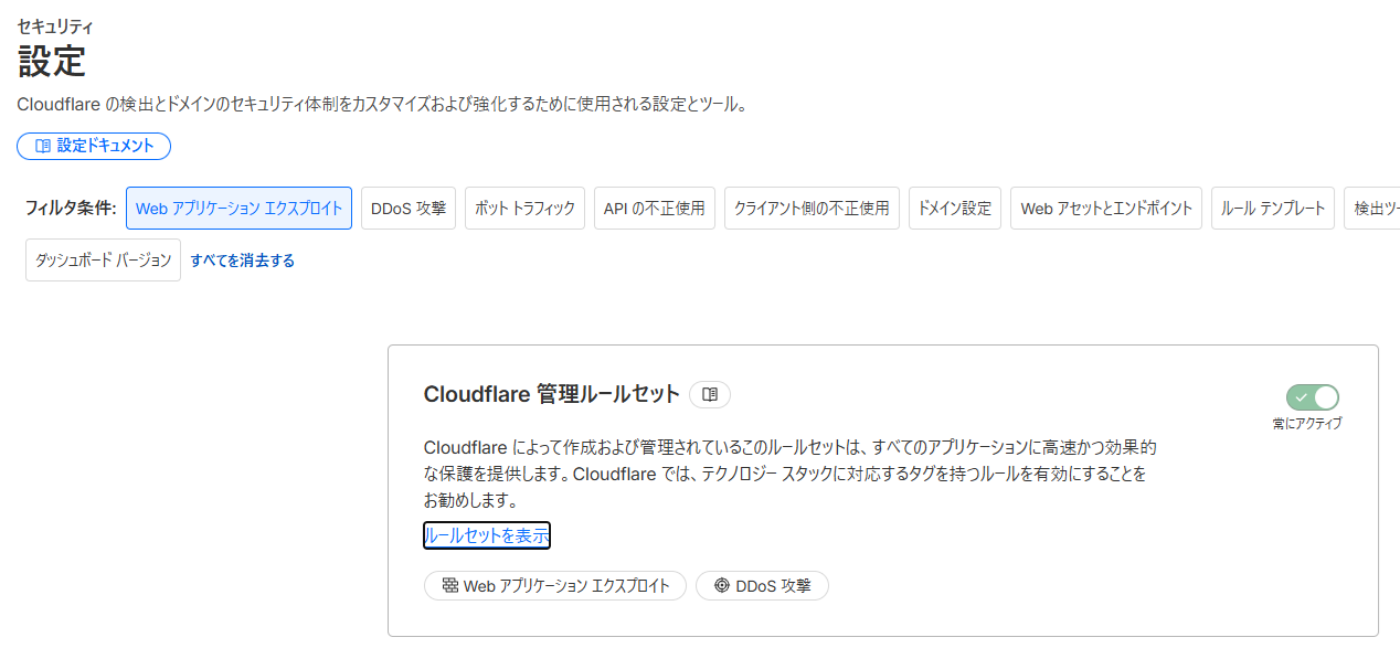 - Security → 設定:Cloudflare 管理ルールセットがアクティブになっていることを確認