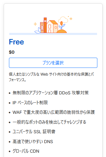 - サイトを追加すると、プラン選択画面が表示されます。今回は無料の「Free」プランを選択してください。多くの基本的なCDN、SSL/TLS、セキュリティ機能が利用可能です。