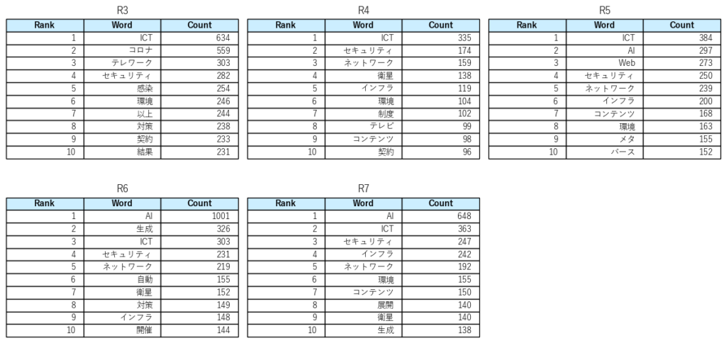 ・まずは令和3年~令和7年の情報通信白書を自然言語処理(形態素解析)し、名詞を抽出します。