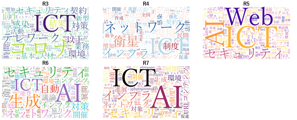 直近5年分の情報通信白書を解析し、政策課題や社会実装の流れを俯瞰してみました。