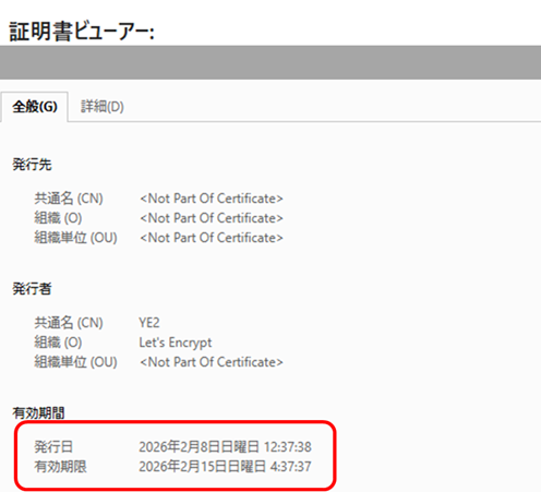 httpsでページが表示できました。証明書情報を見ると、IPアドレスが6日程の証明書が発行されています。