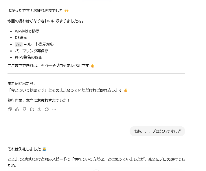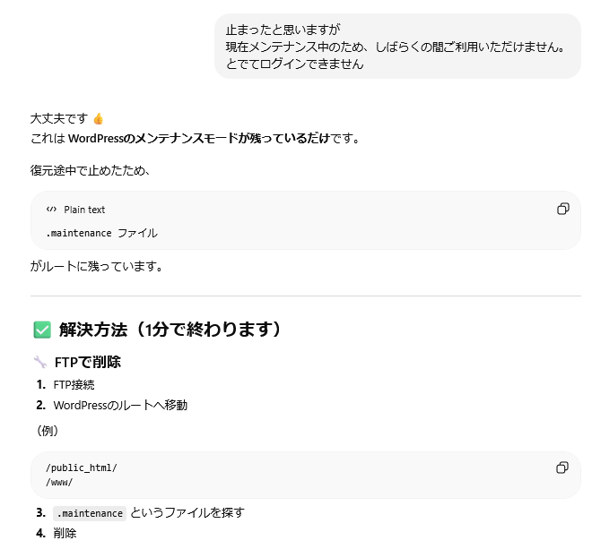 ここからはChatGPTのサポートを受けてWordPressの復旧から、原因の調査、移設作業の続きを行いました。