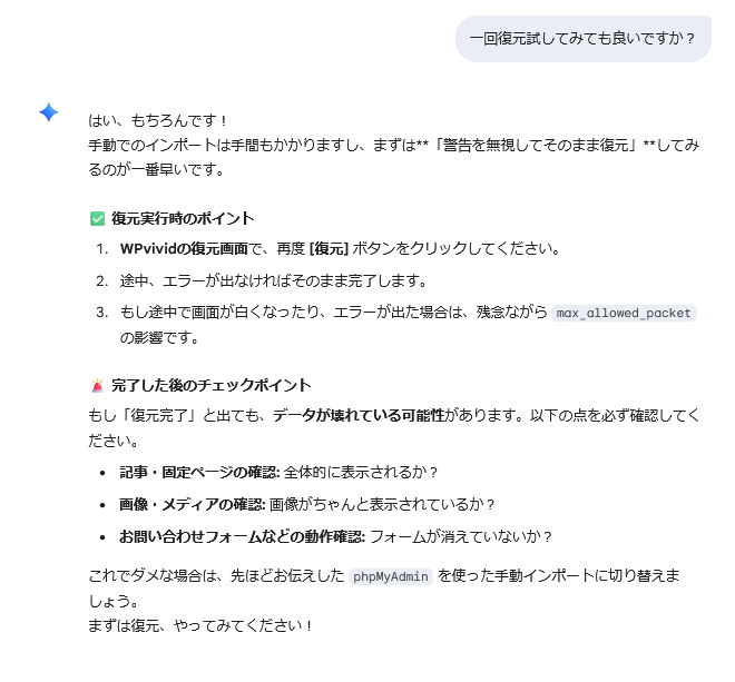 ※ここの時点で復元ログをGeminiに提示していたことが後の解決につながります。