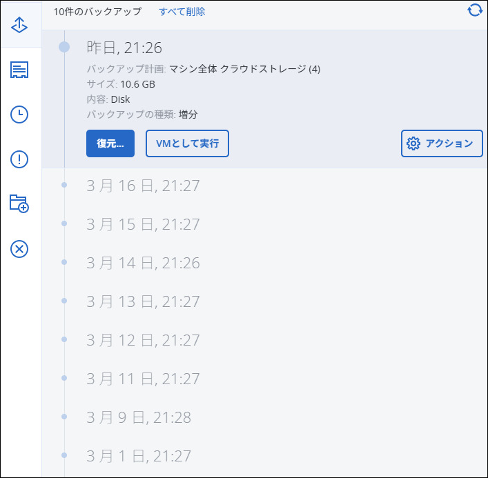 Acronisに慣れているという部分もあるかもしれませんが、Acronisのようにデバイスごとにバックアップが日付順に一覧表示される方が直感的で分かりやすいかなと思います。